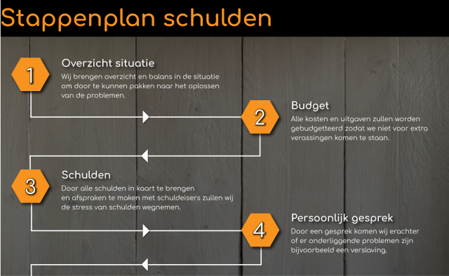 1. Overzicht, 2. Budgetteren, 3. Schulden, 4. Persoonlijk gesprek... Dit zijn de eerste stappen naar een gezonde financiële situatie. Wij werken volgens een vast systeem om uit de problemen te komen en een basis te leren om in de toekomst te werken aan financiële rust. Wij kunnen snel schakelen en adviseren vanwege onze stappen.